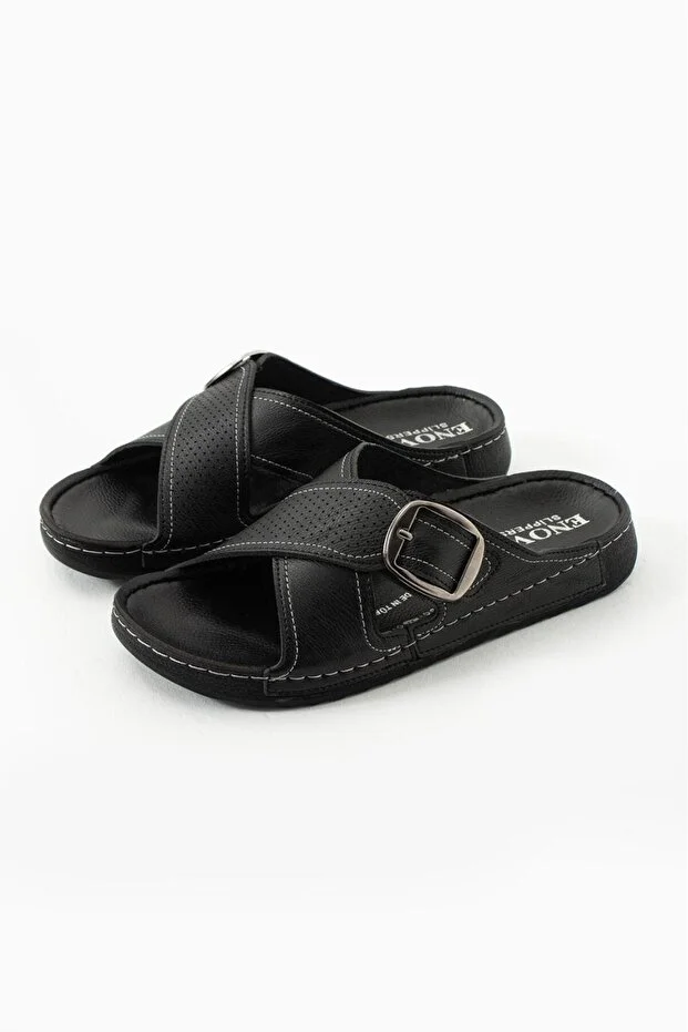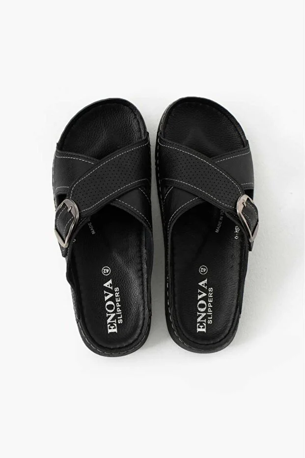 Erkek Deri(SUNİ) Ortopedik Rahat Taban Ayarlanabilen Tokalı Dikişli Şık Dışarı Içeri Erkek Terliği