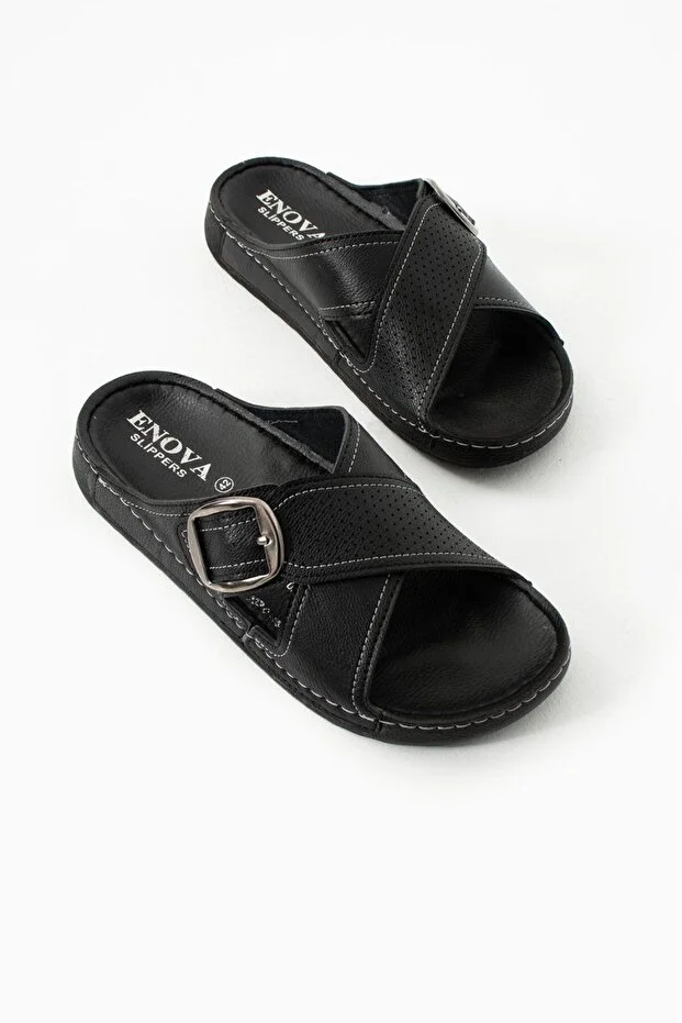 Erkek Deri(SUNİ) Ortopedik Rahat Taban Ayarlanabilen Tokalı Dikişli Şık Dışarı Içeri Erkek Terliği